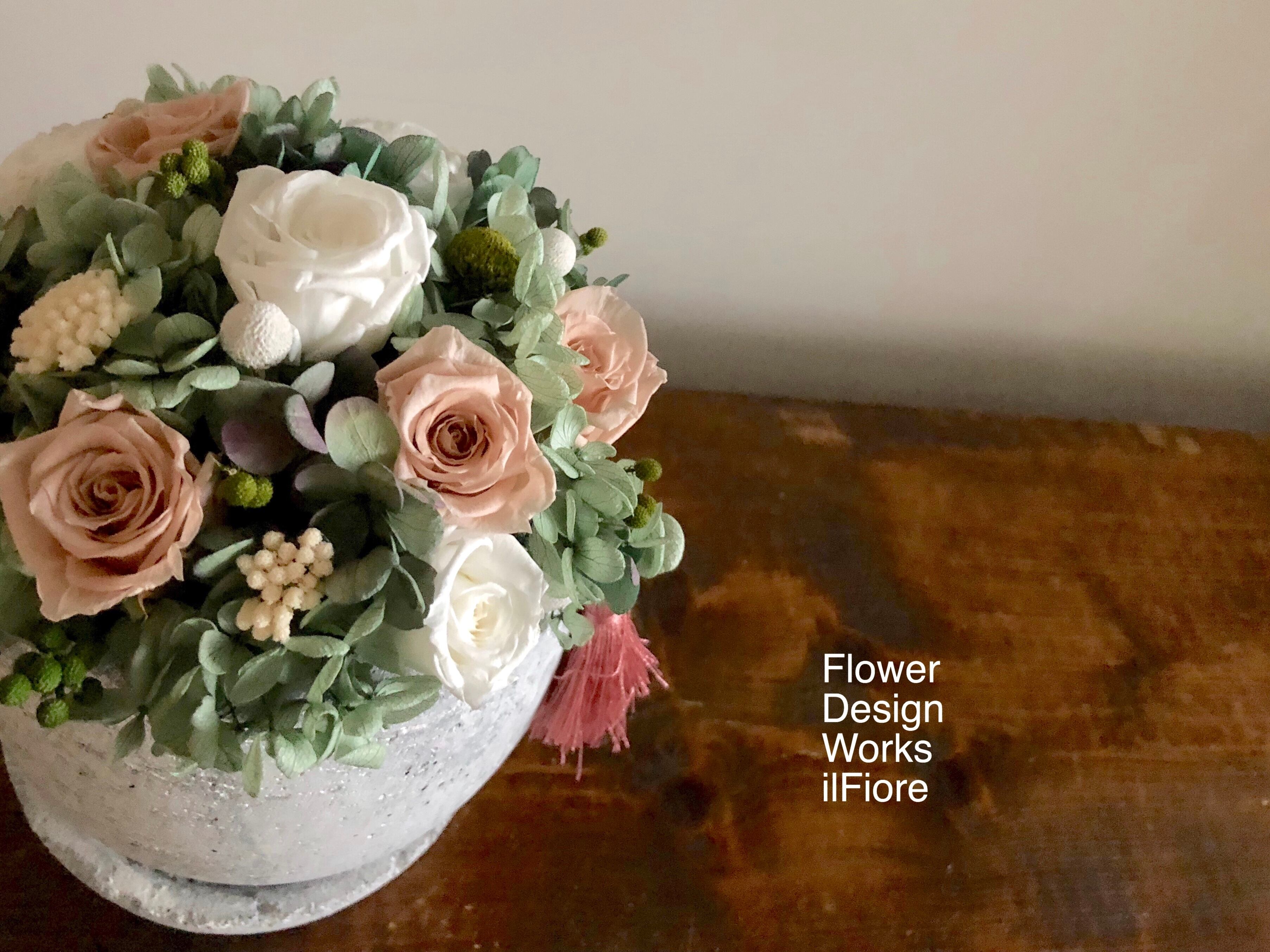 ◆花材:ローズ・アジサイ・バーゼリア・ミレアモア・ブルニア