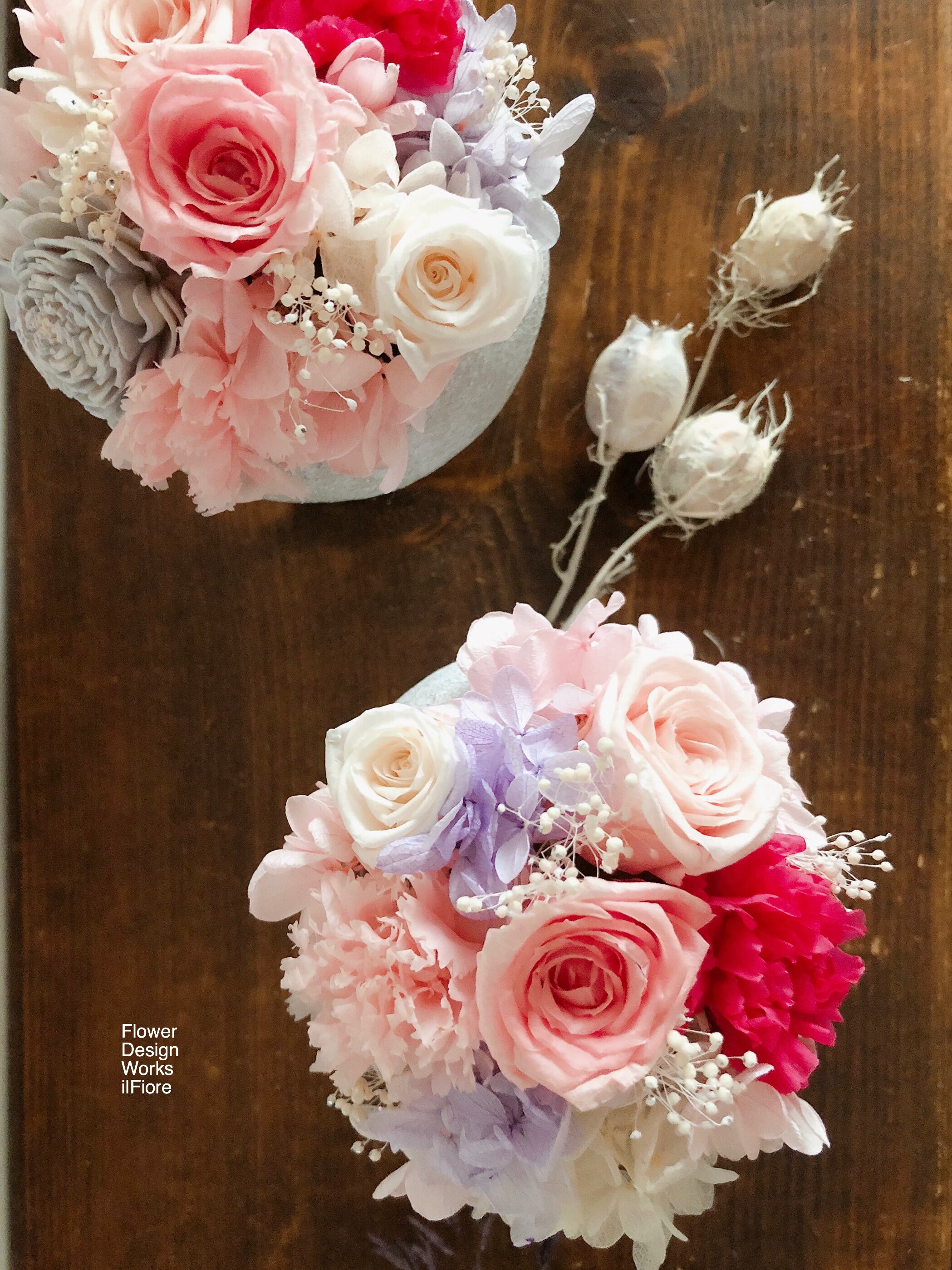 ◆花材:ローズ・カーネーション・ソーラーローズ・アジサイ・カスミソウ